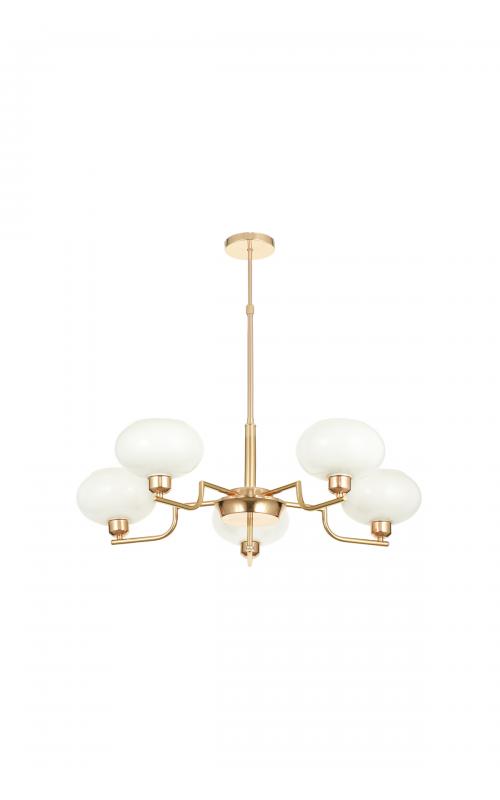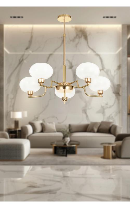 Avizemoda Vanna 5 li Beyaz Camlı Salon Oturma Odası Modern Sarkıt Avize - (Gold Kaplama)