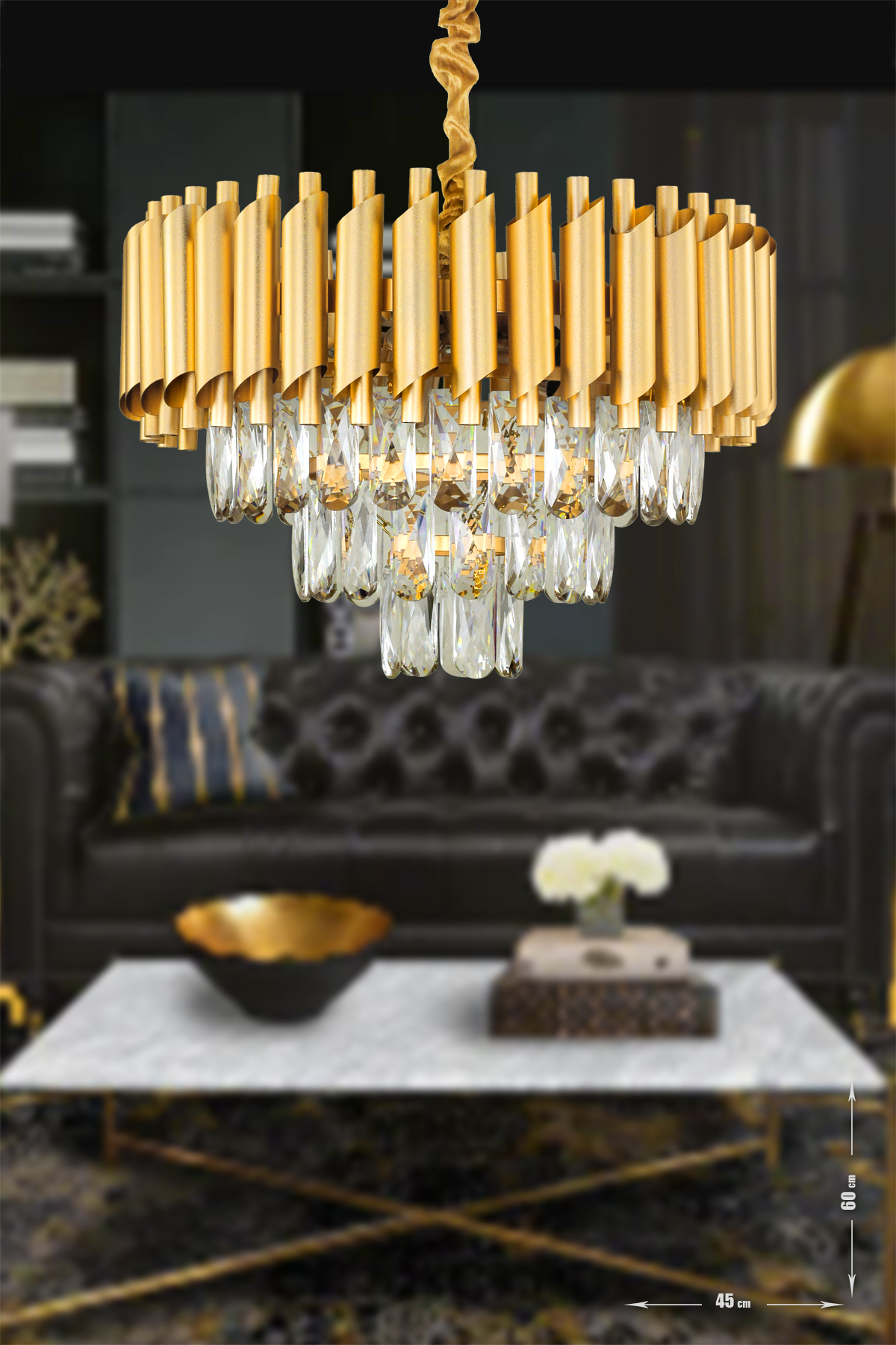 Genişliği: 45 cm (Daire şeklinde) Yükseklik: 65cm Materyal: Metal, Avize Sarı yaldız çift katman E...