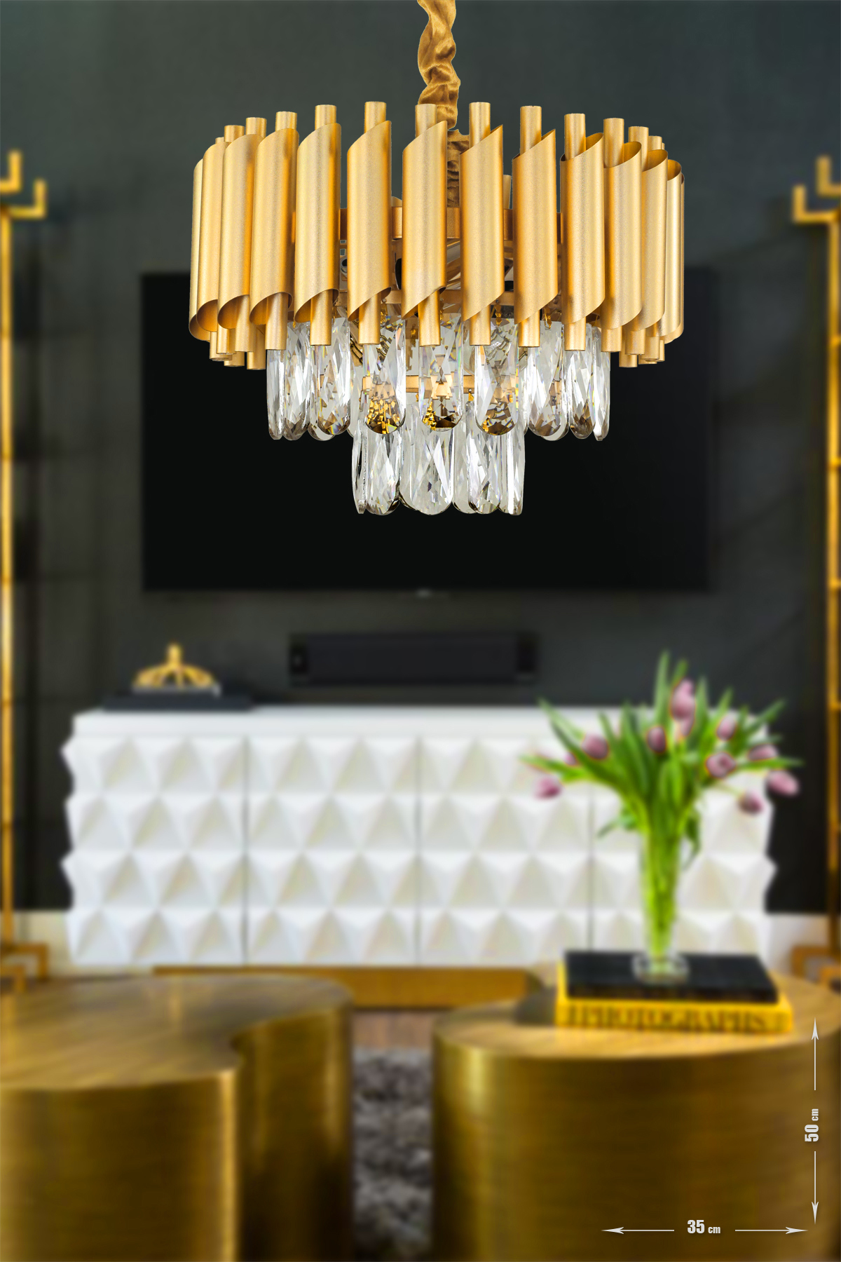 Genişliği: 50 cm (Daire şeklinde) Yükseklik: 90 cm (Avize üzerindeki, zincir sayesinde ayarlanabili...