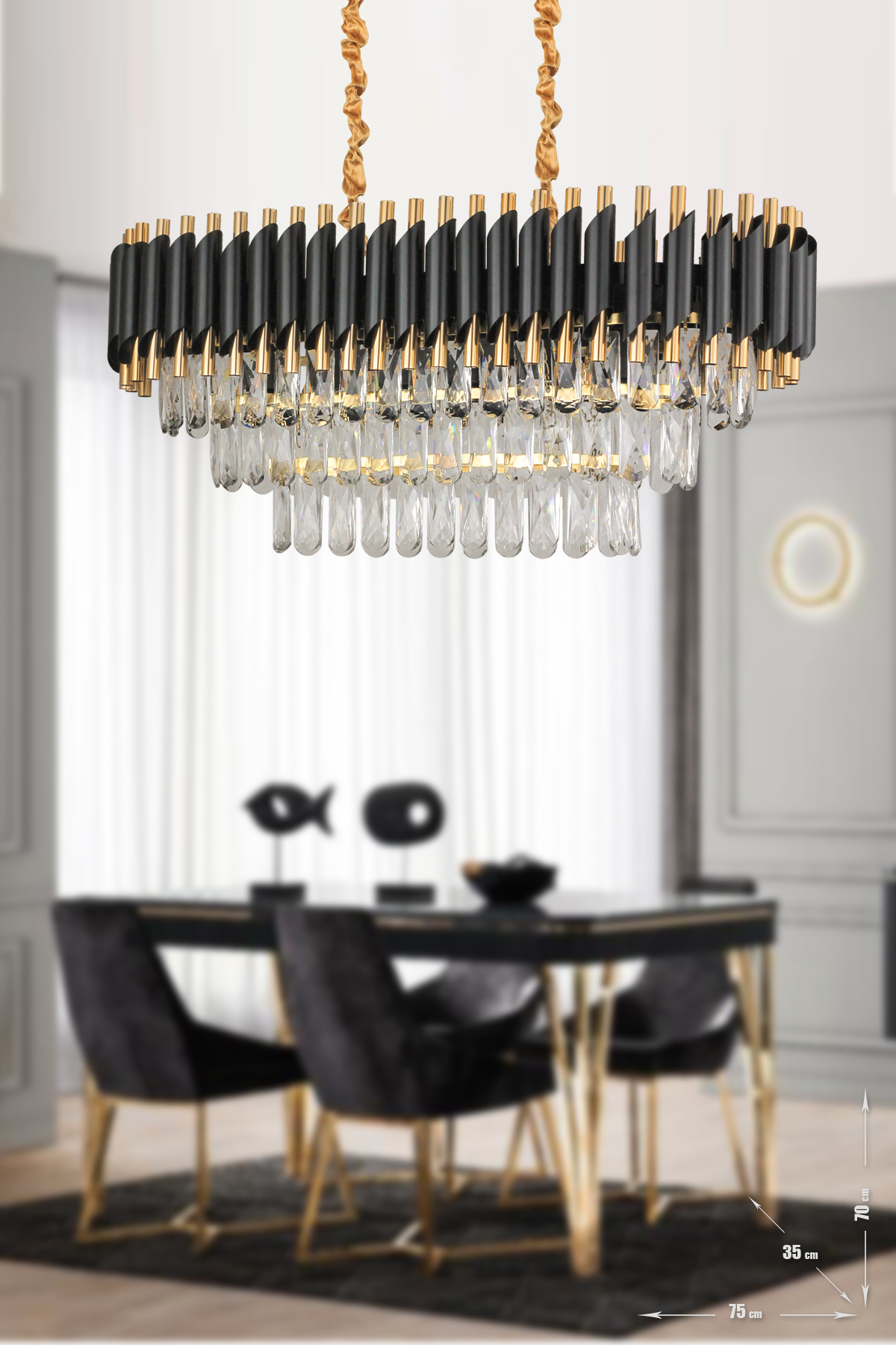 Genişliği: 75x35 cm (Oval Elips şeklinde) Yükseklik: 90 cm (Avize üzerindeki, zincir sayesinde ayar...